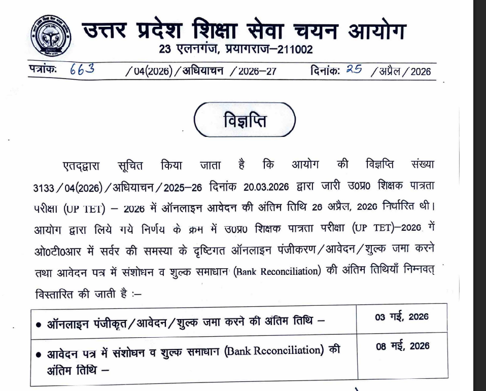 Good news for candidates applying for the Uttar Pradesh Teacher Eligibility Test (UPTET) 2026 — the application and fee payment deadline has been extended, giving aspirants more time to complete the form.
